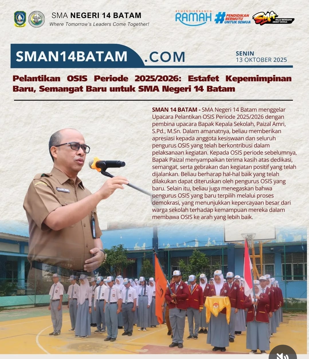 Batam – SMAN 14 Batam menegaskan kesiapannya dalam memberikan layanan pendidikan yang ramah dan inklusif bagi Anak Berkebutuhan Khusus (ABK). Hal ini disampaikan langsung oleh Paizal Amri, S.Pd., M.Sn Kepala Sekolah dalam rapat bersama majelis guru yang juga sekaligus mensosialisasikan petunjuk teknis (juknis) pelaksanaan pembelajaran bagi ABK. Dengan adanya juknis yang jelas, sekolah optimis bahwa penyelenggaraan pembelajaran bagi ABK akan berjalan lebih terarah dan sesuai kebutuhan peserta didik.